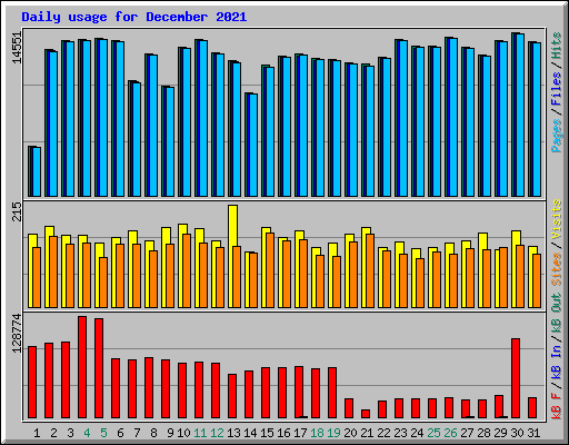 | Day | Hits | Files | Pages | Visits | Sites | kB F | kB In | kB Out | ||||||||