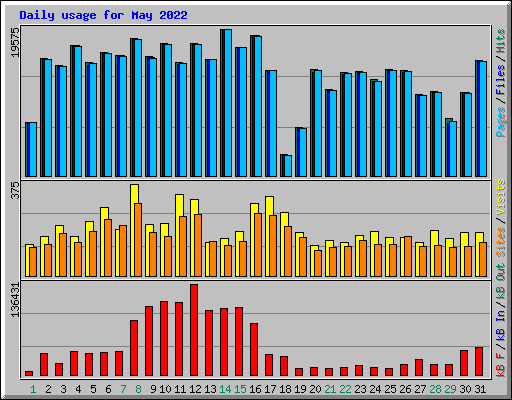 | Day | Hits | Files | Pages | Visits | Sites | kB F | kB In | kB Out | ||||||||