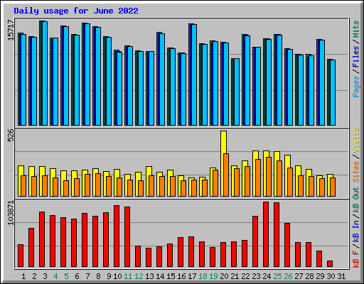 | Day | Hits | Files | Pages | Visits | Sites | kB F | kB In | kB Out | ||||||||